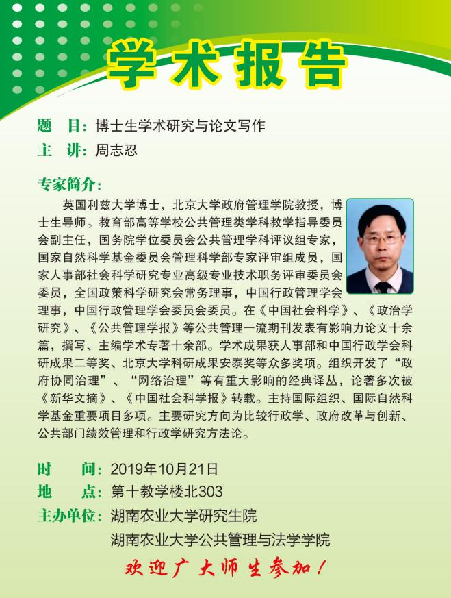 授课名师:英国利兹大学博士,北京大学政府管理学院教授。教育部高等学校公共管理类学科教学指导委员会副主任,国务院学位委员会公共管理学科评议组专家,国家自然科学基金委员会管理科学部专家评审组成员,国家人事部社会科学研究专业高级专业技术职务评审委员会委员,全国政策科学研究会常务理事,中国行政管理学会理事,中国行政管理学会委员会委员。周志忍教授为公法院博士生开展了题为“博士生学术研究与论文写作”的生动授课。