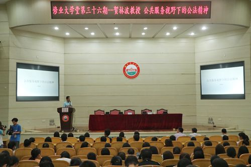 为弘扬学术精神,传播学术文化,营造浓厚的治学氛围,2017年9月28日下午,修业大学堂第三十六期学术讲座——“公共服务视野下的公法精神”于我校图书馆大成厅强势启动。讲座特别邀请到我校公共管理与法学学院院长助理、校学术委员会委员、校级重点学科带头人贺林波教授担任主讲人,由副校长段美娟主持讲座。来自不同学院共六百余名师生或坐或站,共同聆听这场学术盛宴。